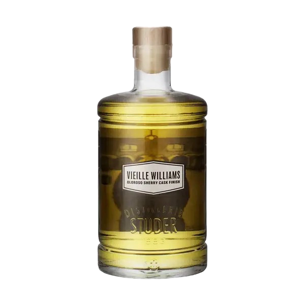 Vieille Williams Sherry Cask Finish Studer – saftige Williams-Birne trifft auf Sherryfass-Eleganz. Weich, fruchtig, lang anhaltend.
